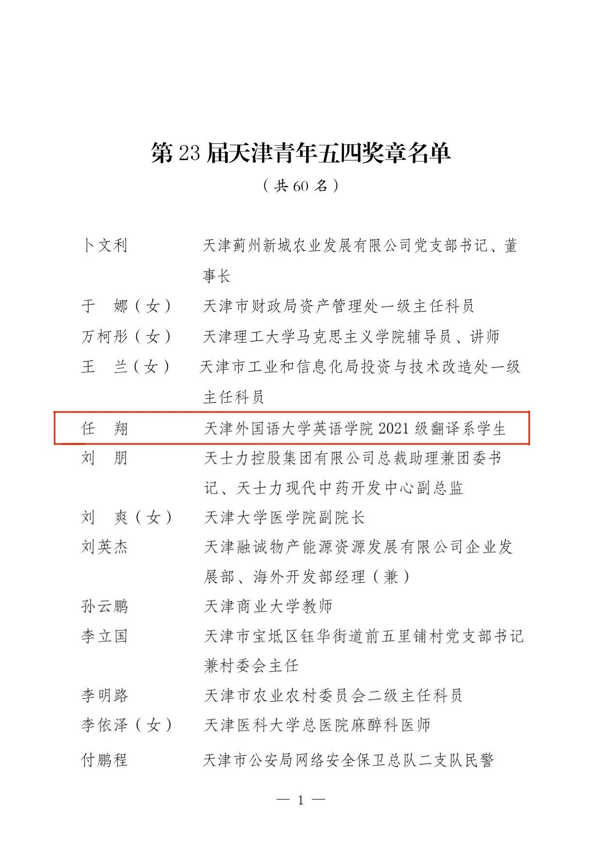 近日,共青团天津市委员会授予天津市60名同志“第23届天津青年五四奖章”称号,作为唯一的在校大学生,翻译系2021级本科生任翔荣获“天津青年五四奖章”。“天津青年五四奖章”是共青团天津市委员会授予天津市优秀青年的最高荣誉,旨在充分发挥青年典型示范引领作用,激励全市广大团员青年踔厉奋发、挺膺担当,以永不懈怠的精神状态和一往无前的奋斗姿态投身全面建设社会主义现代化大都市、奋力谱写中国式现代化天津篇章。